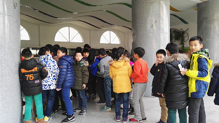 排隊(duì)等待參加機(jī)器人搏擊賽的小朋友們